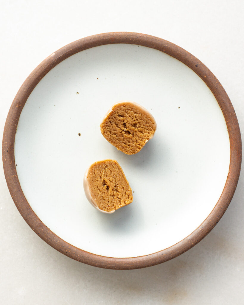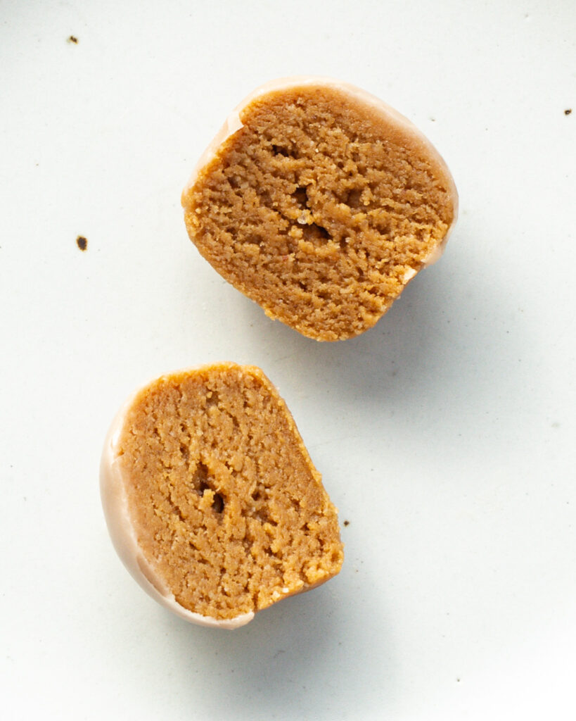 Since this dough is primarily made of almond flour, it will absorb any moisture like a SPONGE. Almond flour is my secret to making anything with a soft, truffle-y consistency. Think marzipan! It’s exactly the same concept. Here there is a bit of protein powder as well, but since the almond flour is the highest in volume, it controls the dough’s consistency.