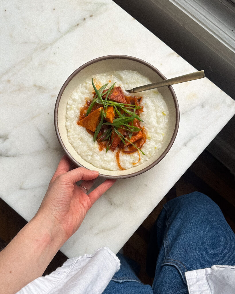 This recipe was daunting to me cuz… 50 mins to boil to Arborio! But alas, it went quickly and I had time to pop the tofu in the oven coated in some extra Gochujang, boil some soft boiled eggs, and drink a beer. Fun to make and so good. The congee was a lovely base that wasn’t too crazy with flavor. Almost like grits if you’re into that. Perfect to serve as a base for buttery tofu. Um… why don’t I always put BUTTER on my tofu? Lesson learned.