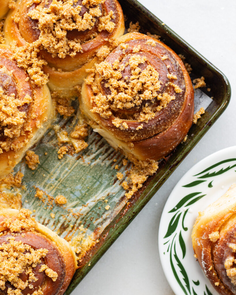 I recommend wrapping the rolls on the tray you cooked them on (after they’ve had the chance to cool to room temperature, of course!) and storing them in the fridge. Then, when it’s time to reheat them, set your oven to 325°F, unwrap the rolls and warm them up for 8-10 minutes in the oven, or until they smell all toasty.