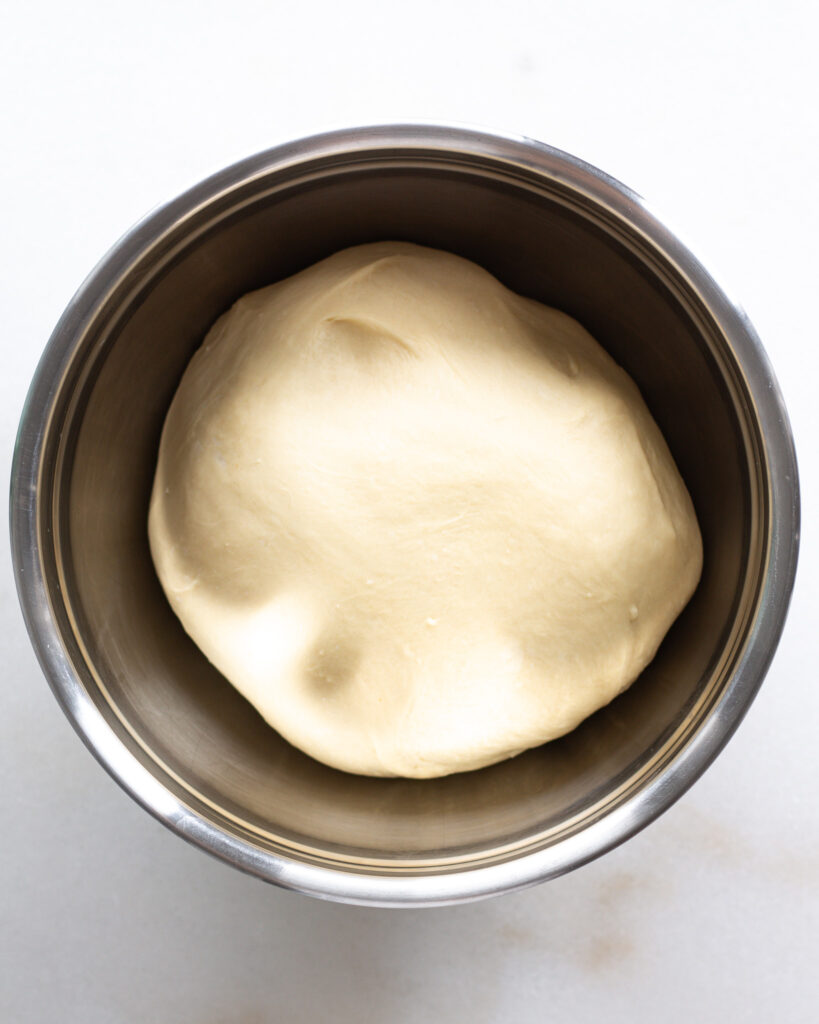 - Adding one cube at a time, add the softened butter to the dough. Let each piece mix in before adding the next. The dough will be shaggy first, then sticky, then tough. When it is mostly together, turn the mixer to medium and let it mix until the dough is smooth and completely pulling away from the sides, 4-5 minutes. This dough is dense, so feel free to press it down into the mixer if it starts to creep up the sides of the bowl.