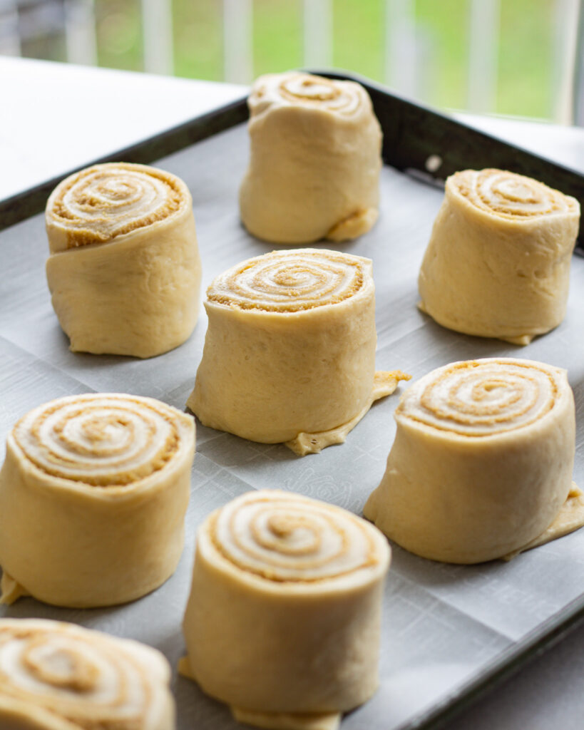 Tip #5 – Use a sharp knife or dental floss to cut the cinnamon rolls. With this recipe I’ve always used a sharp knife, since the dough can hold up to it. But some people (perfectionists, I’m looking at you!) use an unflavored dental floss to make the perfect cuts on their cinnamon rolls.
