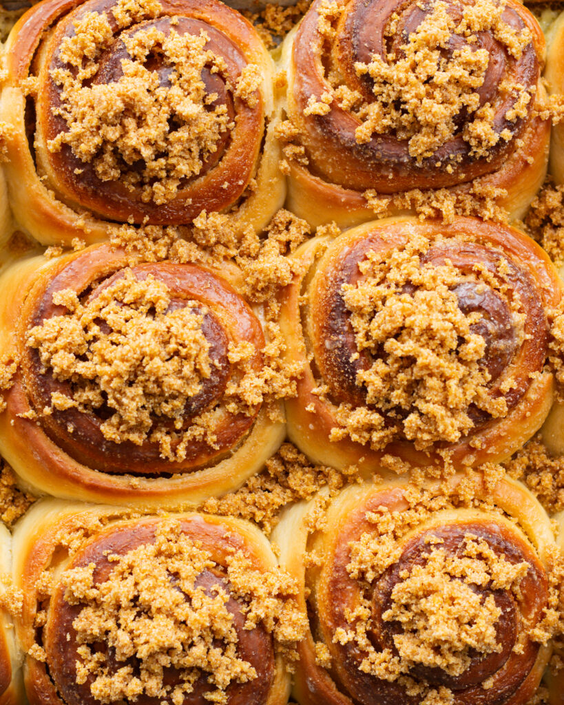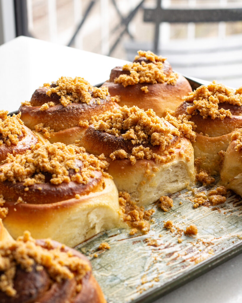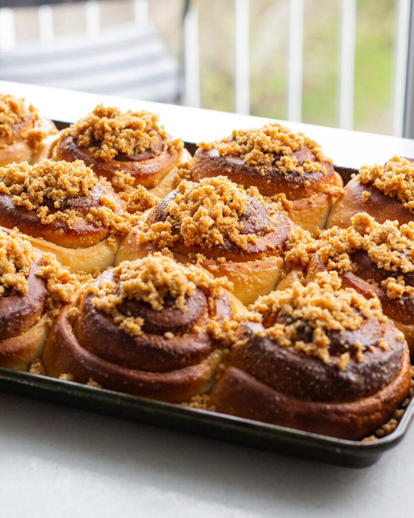 The crumble topping was not my favorite aspect but it’s simply personal preference as I’m not a fan of turbanido sugar. Next time (as there will definitely be a next time) I might try and add flour to the crumble topping so I can sprinkle it on top of the rolls before baking.