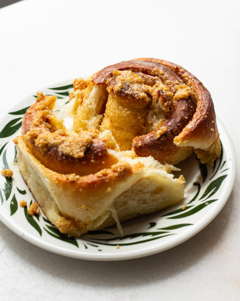 Rolls baked out well and the brown butter/cornmeal/brown sugar filling was lovely. The dough was tough for my stand mixer to handle, but continually pushing it down with a spatula eventually resulted in a beautiful dough. Used a pastry brush to put on heavy cream before baking so there wasn’t too much pooling which worked out well. My main problem was with the toppings. The crumble was so greasy and buttery that it could not crumble at all; I ended up leaving it to the side and let people add it if they choose. The icing was very thin and strong, should the recipe be 1 tsp of bourbon? All in all a delicious recipe if you’re able to make a few changes to the toppings.