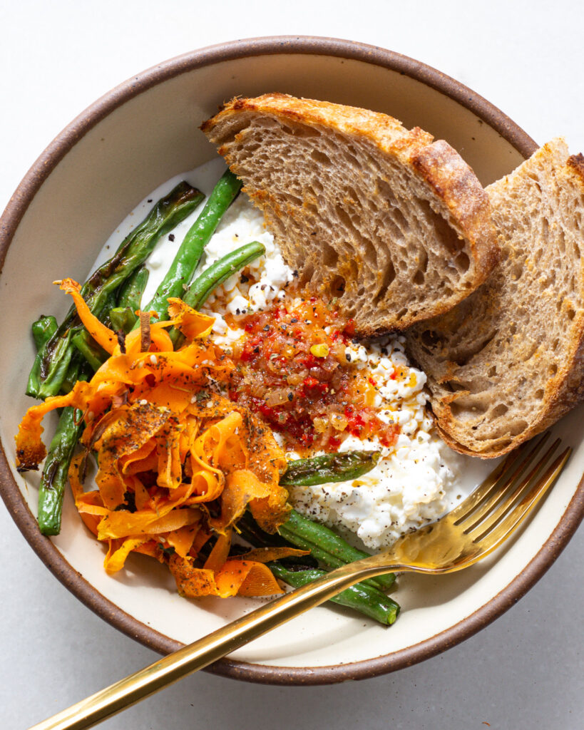 This particular cottage cheese bowl uses roasted za’atar vegetables and a drizzle of fresno pepper sauce, but you can swap out the vegetables as you please and the result is still just as delicious. Use what’s in season to make the ultimate cottage cheese bowl, because lucky for us, cheese is always in season 🙂