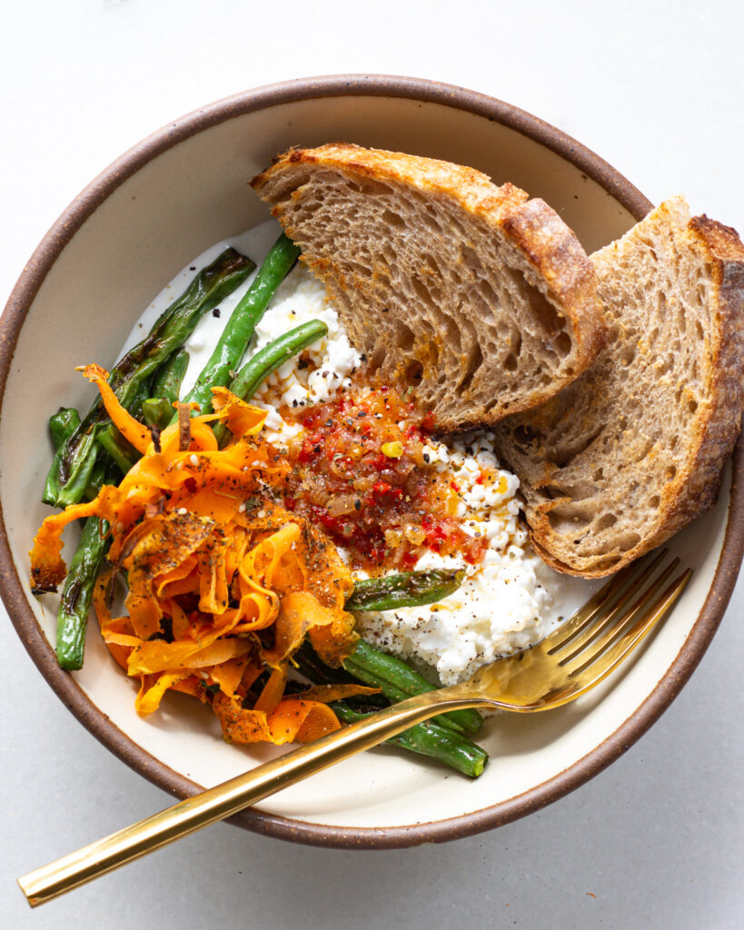 - To serve, add a scoop of cottage cheese to the center of two bowls. Add the vegetables on one side and the toast on the other. Spoon the hot sauce into the center of the cottage cheese, add a few cracks of freshly ground black pepper and enjoy!