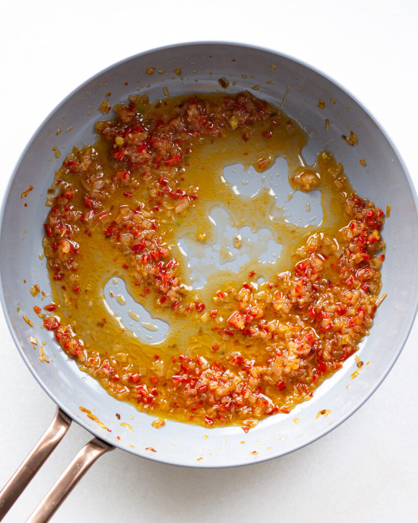 - Put a small sauce pan on medium heat and add 1 tablespoon of olive oil. Add in the shallot, fresno pepper and cook for 2-3 minutes, stirring occasionally. Season with salt and add in the garlic. Cook another 2-3 minutes, stirring to combine. Add in the honey and apple cider vinegar and stir to create a shimmery hot sauce. Turn off the heat. Taste and season as needed.