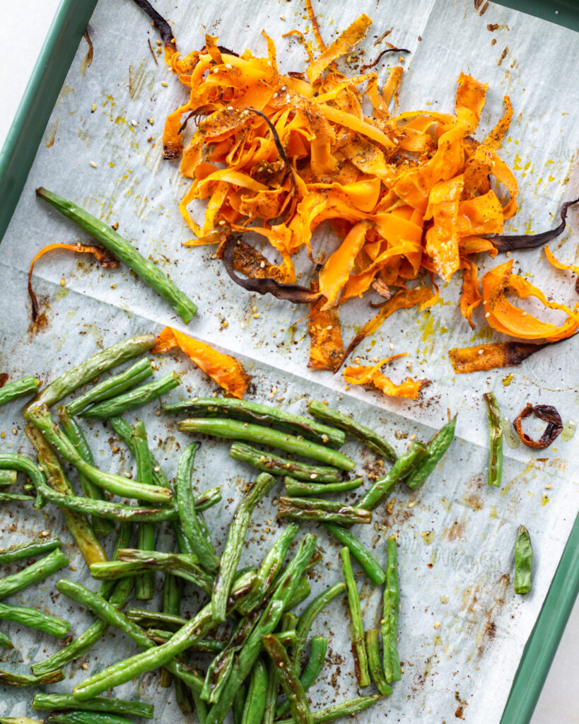 - Spread the vegetables out evenly on a parchment-lined baking sheet and season with salt. Roast at 425°F for 15-18 minutes or until the edges of the carrots are brown and the green beans have charred on the bottoms.