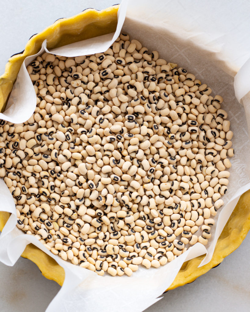 - Remove the crust from the fridge and top it with a sheet of parchment paper. Add in your baking beans or marbles to weigh the crust down (you can also skip this if you don't have baking beans and just bake without weighing down the tart dough, it's just an extra helpful trick!). Put the crust in the oven to bake for 18-20 minutes at 375°F.