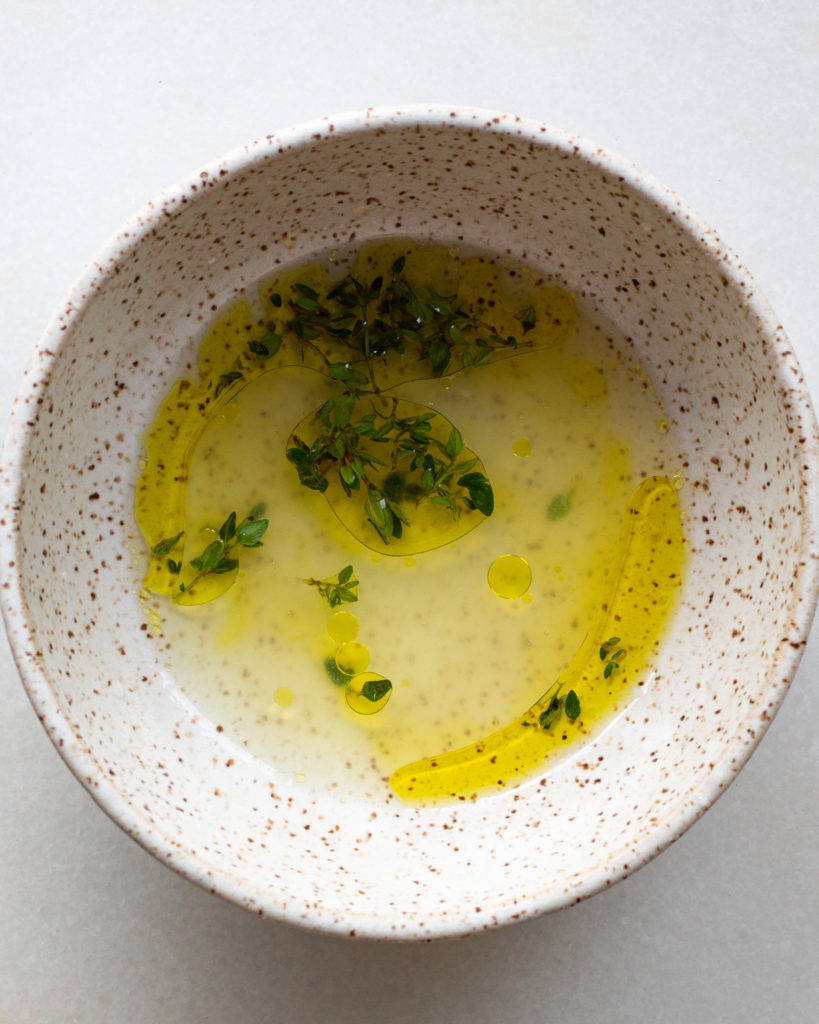 - In another small bowl, whisk together a healthy glug of olive oil and the juice from one lemon. Add the remaining thyme leaves and set this aside.
