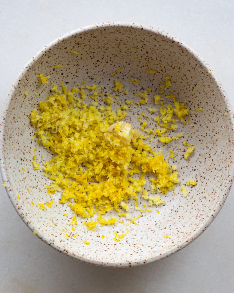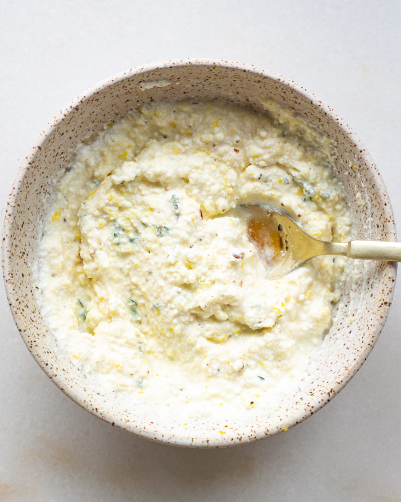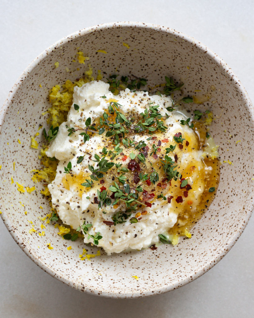 - In a small bowl, grate in the zest from the lemon and the three garlic cloves. Add in the ricotta, honey, red pepper flakes, and the leaves from 3 sprigs of thyme. Season with salt and pepper and stir to combine.