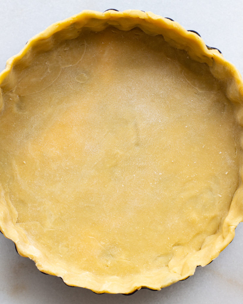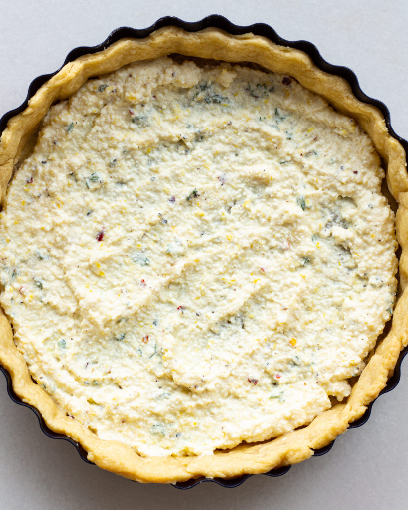 Here we are blind-baking or par-baking the crust. This means baking it empty, before adding the filling. This makes sure the bottom of the crust is crispy when the tart is done, even though the ricotta might try to get in the way.