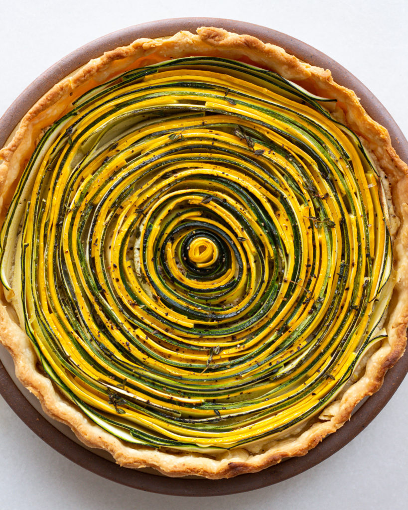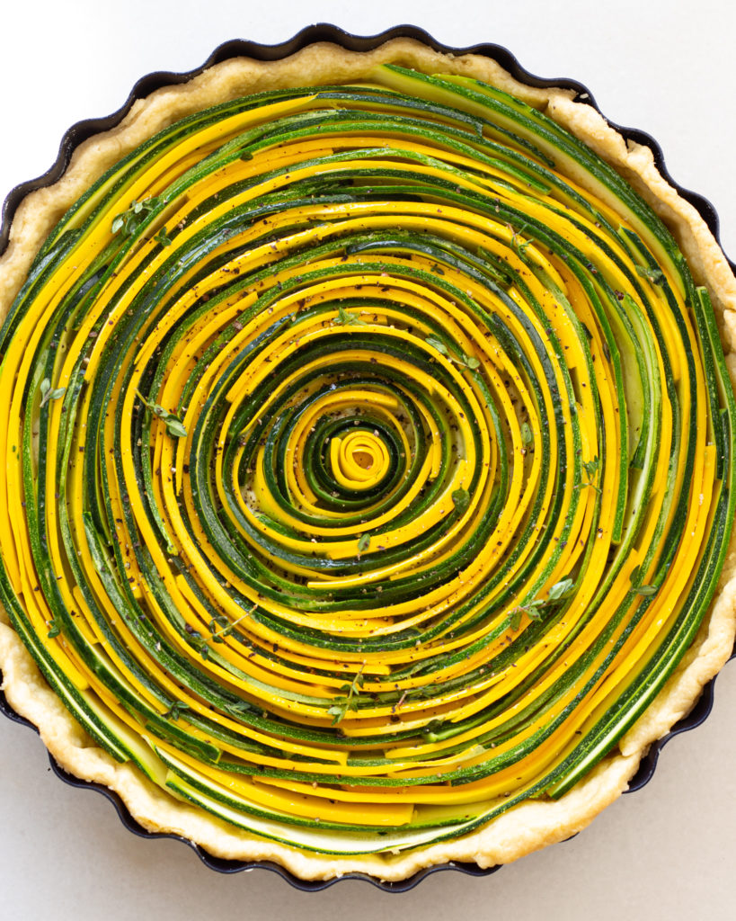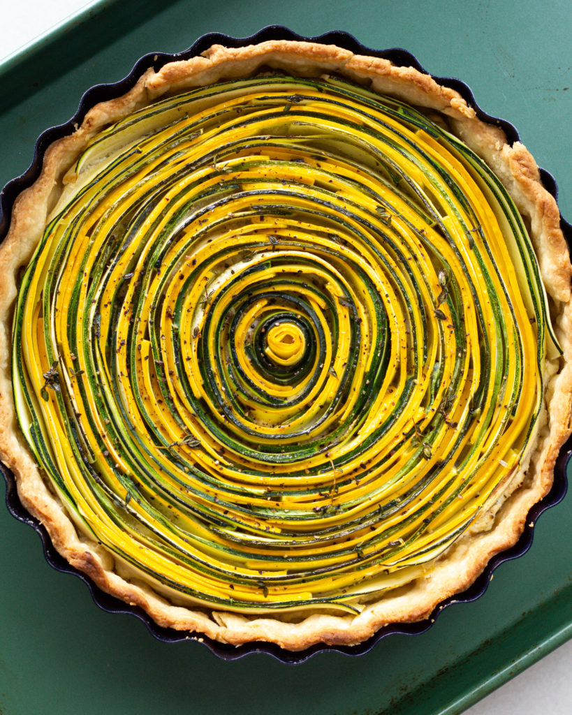 This is called a courgette tart, and not a zucchini tart, only because the term “courgette” covers both summer squash and zucchini – I’m not trying to be fancy here! Just ~efficient~ with how I explain this, because this tart is beautiful, but only because it combines the gorgeous colors of both zucchini and summer squash in perfect lil’ concentric circles.