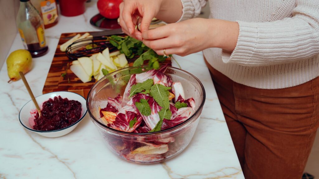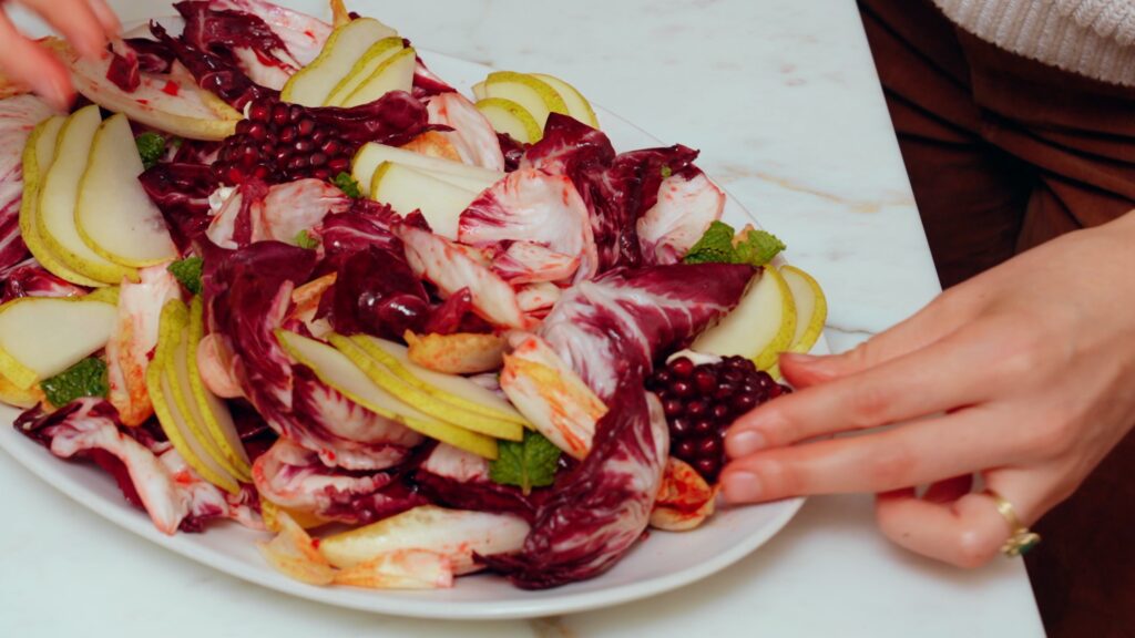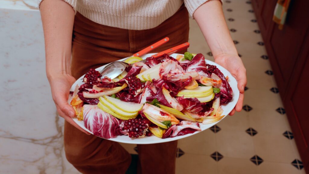 Thanksgiving is a treat holiday, so I want to use *treat* lettuces. Meaning: lettuces we aren’t whipping out any old time. I like radicchio for its bitter notes, and endive for how it easily slices into big, scoopable cups.