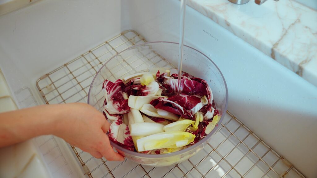 - Slice the radicchio into quarter and remove the core. Pull apart the leaves and add them to a salad spinner. Do the same with the endive. Wash and dry the lettuces well.