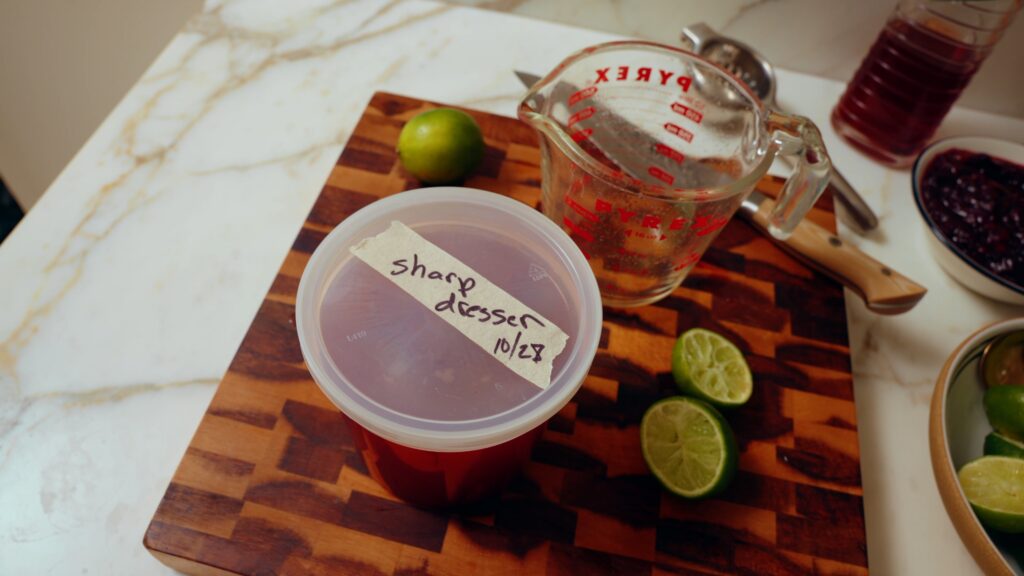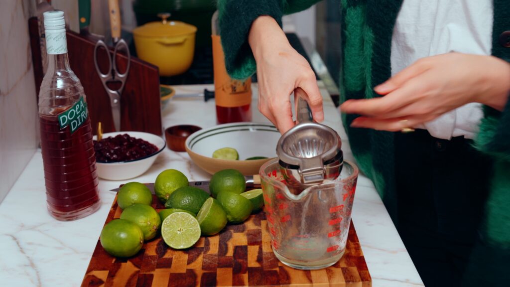 It starts with 1 cup of lime juice, which is about 8-10 limes. Then whisk in 2 tablespoons of cranberry sauce.