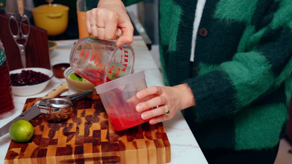 - Add the lime juice and cranberry sauce to a jug or quart container. Mix well.