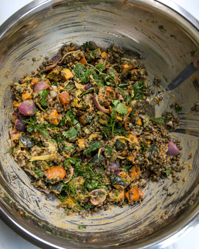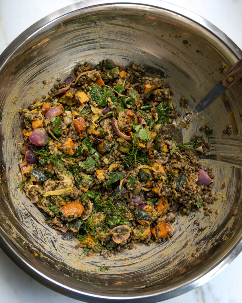- (A small "hack" here is to add splashes of hot water to the bowl as you mix, which sounds odd, but it will make the dressing all creamy with the lentils).