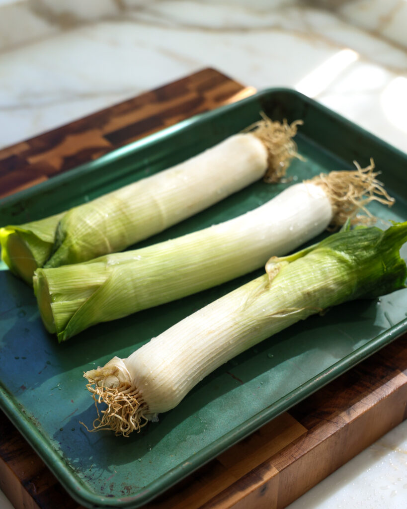 - Cut the green tops off the leeks (reserve them for stock or another recipe). Clean the white bottoms well, then place them on a sheet pan. Roast these on the bottom rack of the oven, uncovered, for 40-45 minutes.
