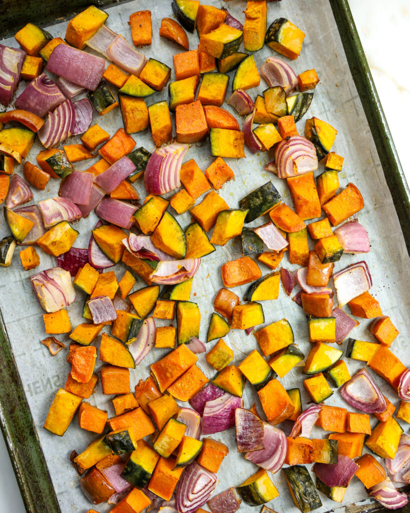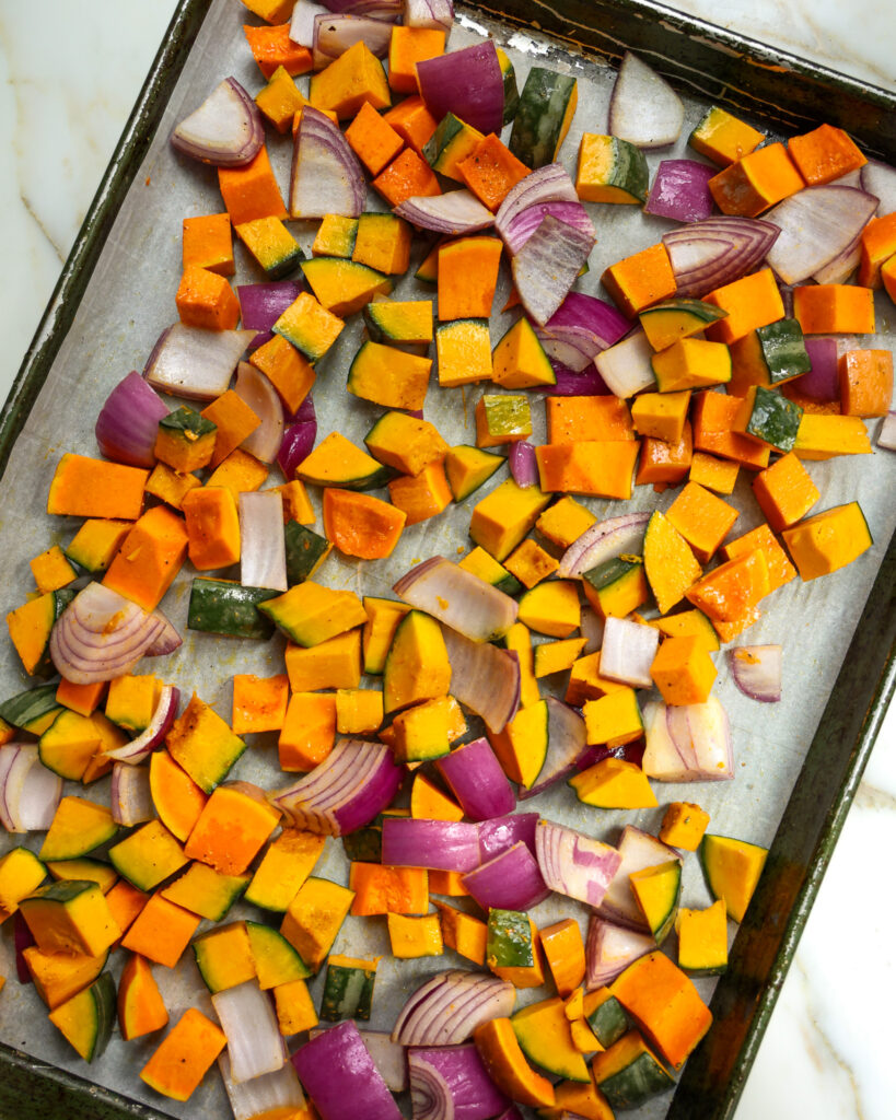 - While the leeks are roasting, dice the squash and red onion and add them to a sheet pan. Drizzle with 2 tablespoons of olive oil and season with salt and pepper. Roast these on the top rack for the remaining 20-25 minutes while the leeks finish.