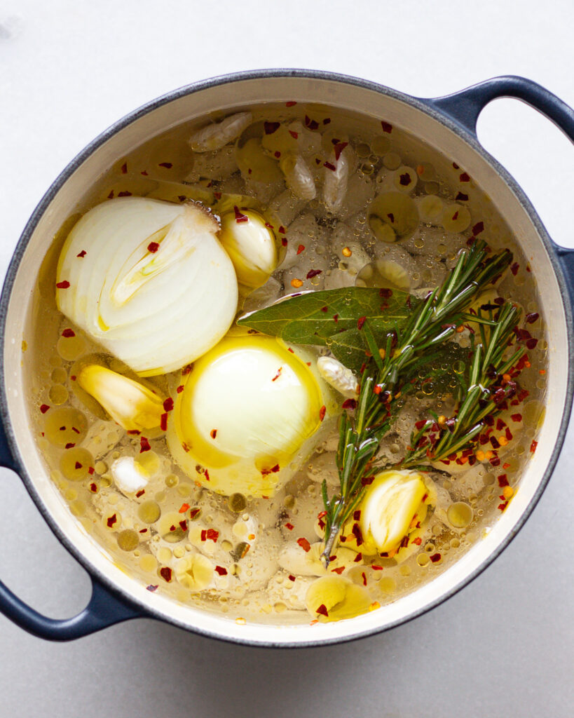 - In a large dutch oven or heavy-bottomed pot, add the onion, garlic, rosemary, red pepper flakes, bay leaves, and olive oil. Drain the beans and add them to the pot. Cover with about 3 inches of water.