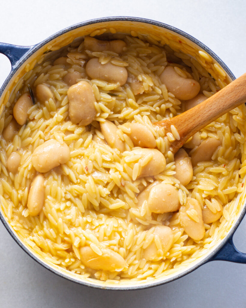 - When the beans feel almost cooked through, remove the onion, rosemary sprigs, bay leaves and garlic cloves. Add in the orzo and stir.