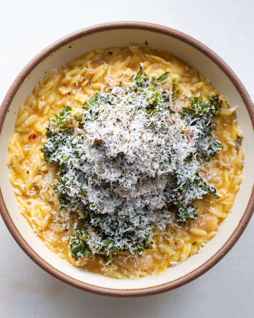 - Plate with a generous serving of the orzo, then a pile of the crispy kale, and then freshly grated parmesan. Serve warm!