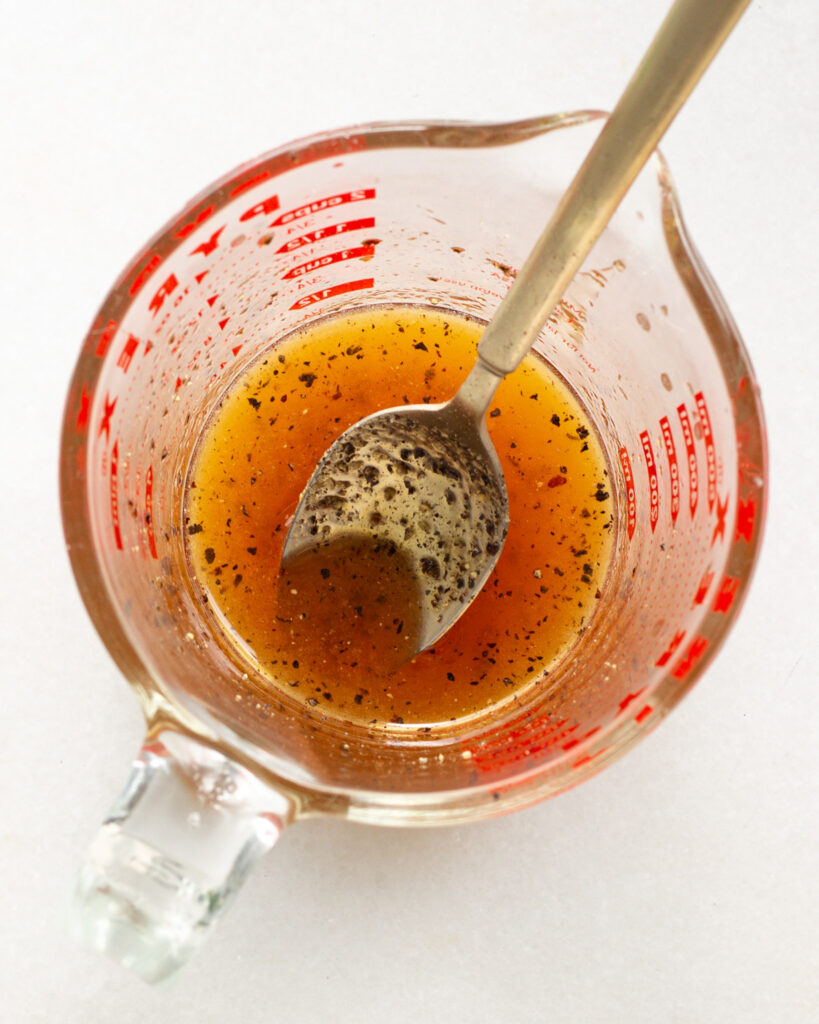 - Whisk together the honey, lemon juice and red wine vinegar in a small bowl. Season with a generous pinch of salt and a lot of cracks of black pepper.