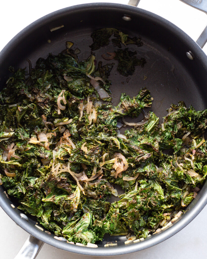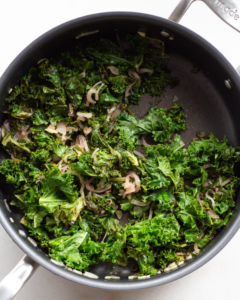 - Let the kale wilt a bit, then turn off the heat and cover the pan.