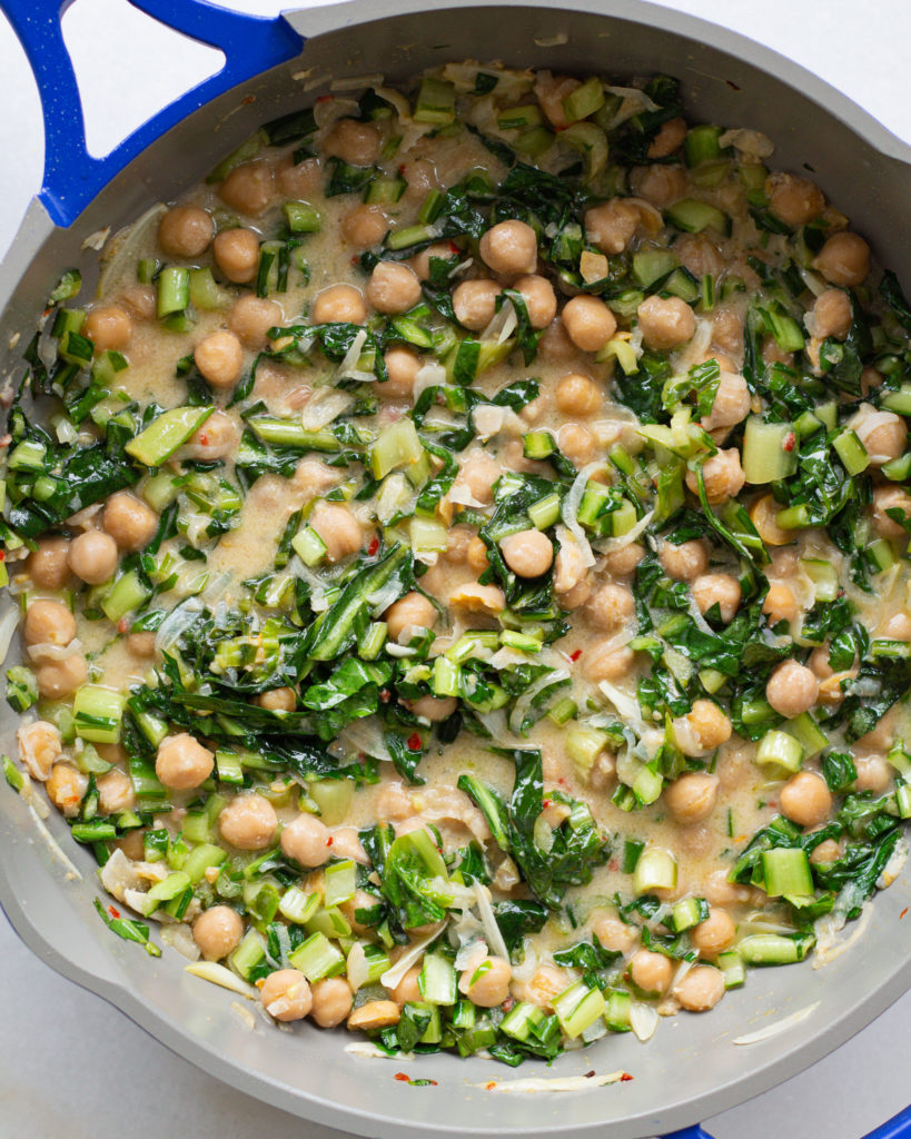 I make this frequently when I want something quick and tasty for dinner. I always have chickpeas and tahini on hand and throw in whatever greens I have. Toasted pita or sourdough completes it!