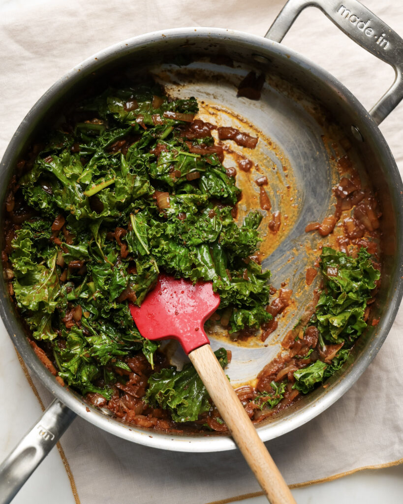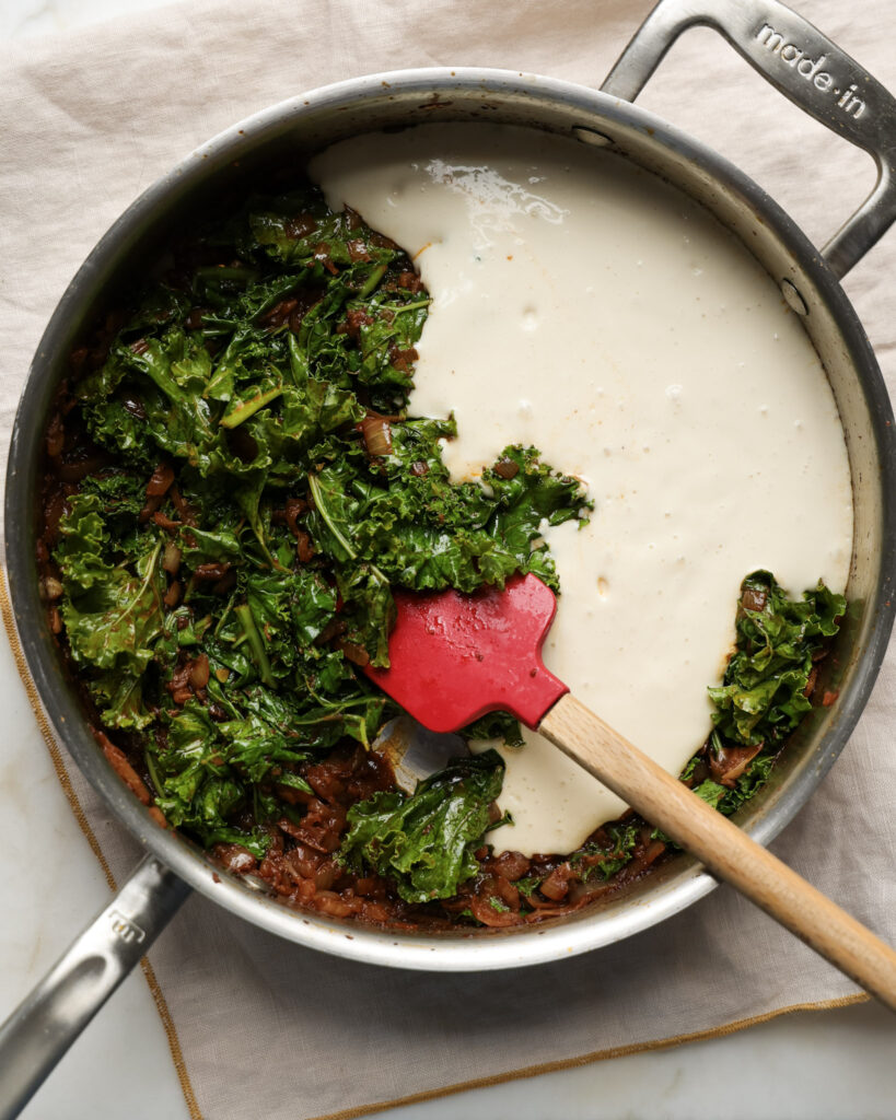 - Add the torn kale to the sauce. Stirring often, let it wilt down into the sauce, 2-3 minutes. Stir in the blended tofu. Taste and season with salt and pepper as preferred.