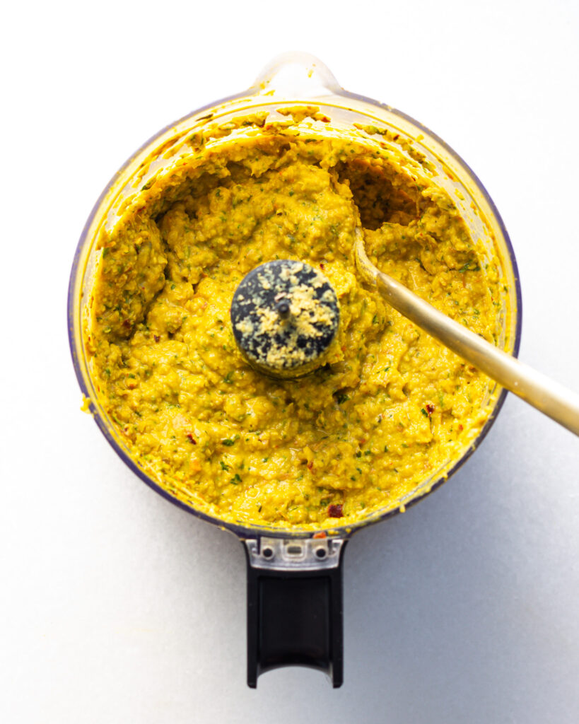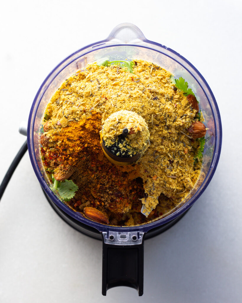 So begin by soaking the almonds in boiling hot water for 5 minutes. Add the nutritional yeast, cilantro, garlic, ginger, spices and apple cider vinegar to a food processor. Drain the almonds and add them to the food processor with an additional 1/2 cup of water. Pulse until roughly ground, then add the beans, season with salt and process until smooth. Set aside and start the other parts of the recipe!
