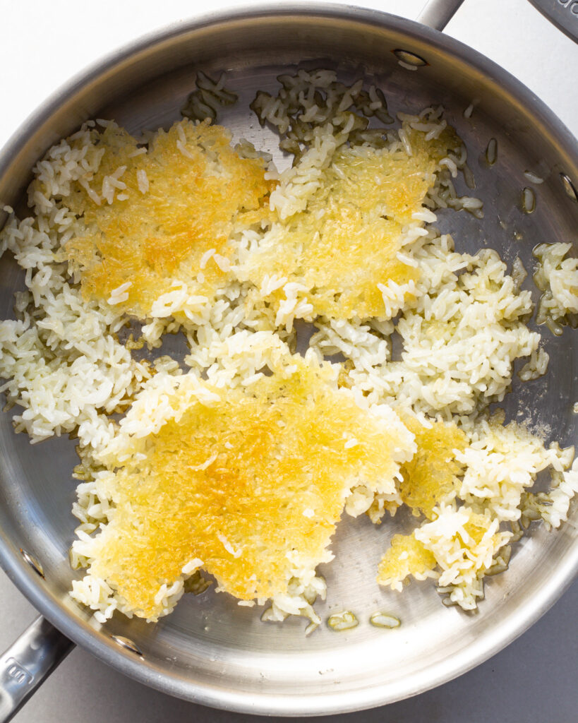 - At this time the rice should be done. To make it crispy, put a sauté pan on medium heat and add a generous glug of olive oil. Add in the rice in one even layer and lightly smash it down. Cook, undisturbed for 5-7 minutes or until the rice is deeply golden on the bottom. Cut it into big chunks and remove from the pan.
