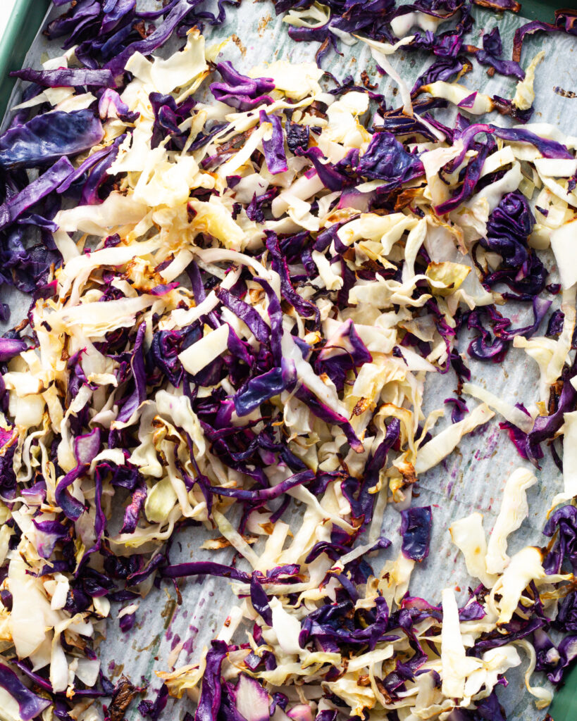 - Thinly slice the cabbage and scatter it onto two baking sheets. Drizzle with olive oil and season with salt. Toss to coat. Roast in the oven at 400°F for 20-22 minutes or until the edge pieces are golden brown and beginning to crisp.