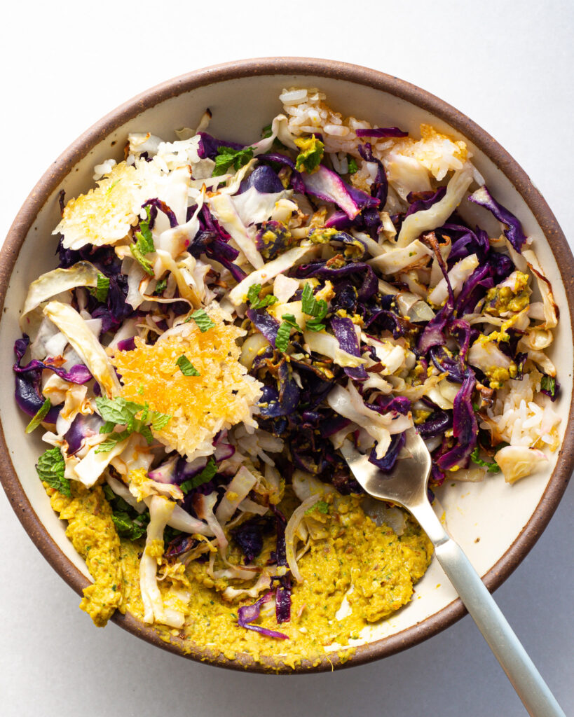 - To plate, start with a scoop of the turmeric mash, add a pile of the lime cabbage and then break the crispy rice over top. Sprinkle with chopped mint or basil and enjoy!
