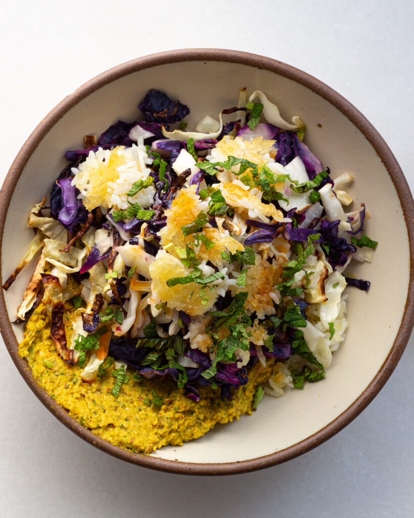 The turmeric mash here is less of a smooth dip, and more of a chunky, mixable base for the crispy lime cabbage. It does the job of both a salad dressing and a hummus in one. When you mix this mash together with the crispy cabbage, the natural sweetness of the cabbage and juice from the lime melds together with the smooth mash and you get this natural dressing, while still having a very hearty component to the meal.