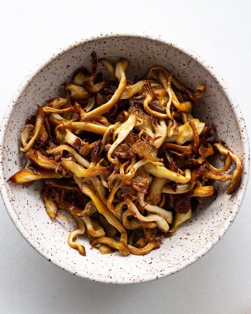 - Then, in batches, cook the oyster mushrooms until they are golden brown and crispy. This means tossing them in the oil to coat, and then letting them cook for about 3-4 minutes on each side. Add salt to taste, move them to a large bowl and set aside.