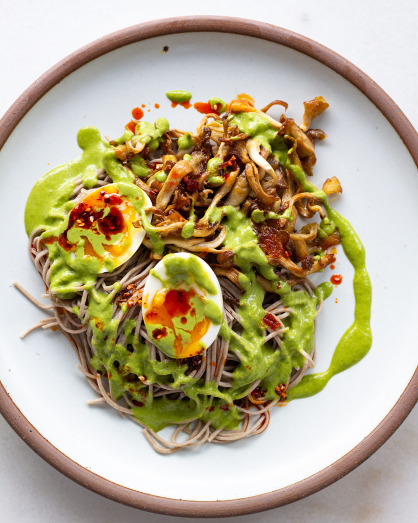 Outside of whipping up a quick blender dressing, this recipe is just about pan-frying the mushrooms (I know, I love a ‘shroom right now), boiling the noodles and then adding in the eggs. It can be thrown together as a quick weeknight meal, or you can dress it up for a more fun and interactive date night. If it were me, I’d put the herby dressing to the side and dip the soba noodles like there is no tomorrow, but if you’re into ~plating~ you can copy what we did here! The world is you oyster (mushroom) 😉