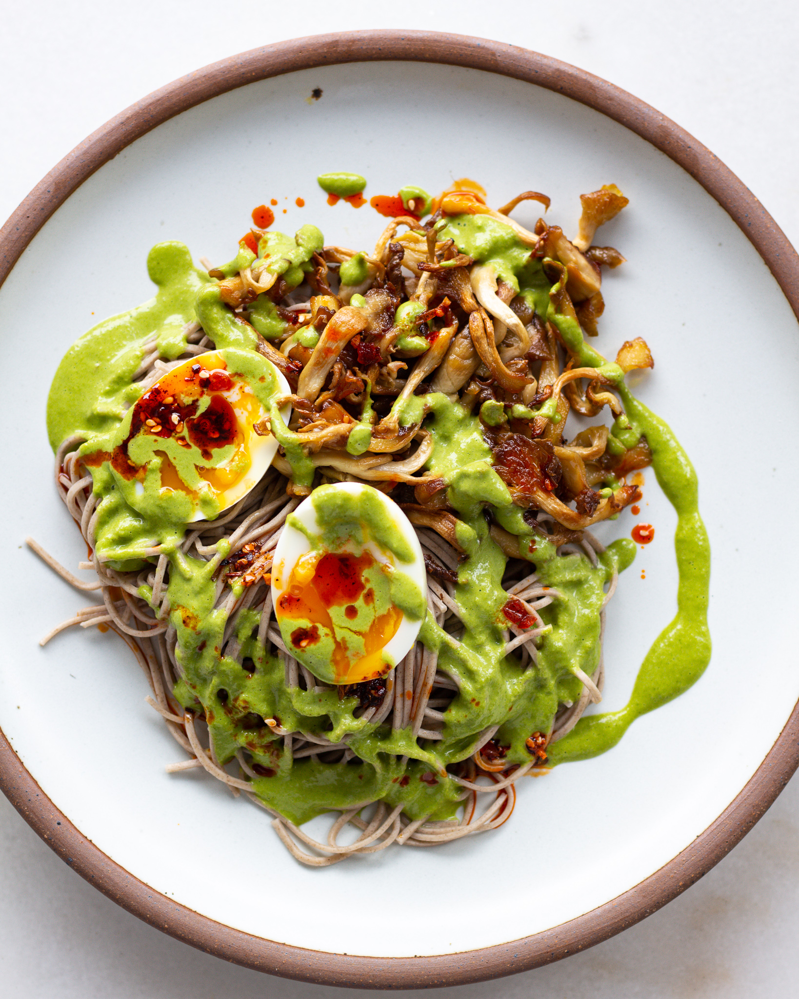 - To plate, portion out the soba and mushrooms evenly onto two plates. Cut the eggs in half and add them to the plates. Either drizzle with the herb oil, or have it in a small bowl to the side for dipping. Top with optional chili oil and enjoy!