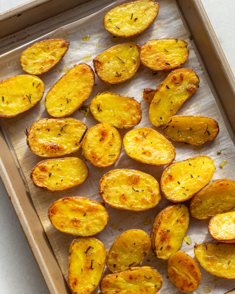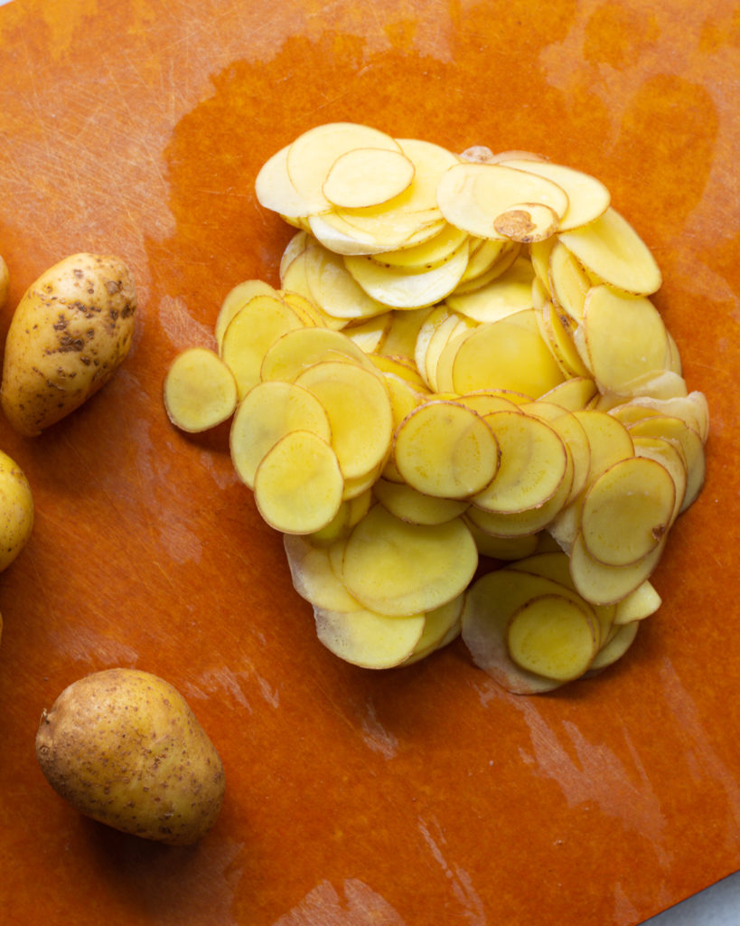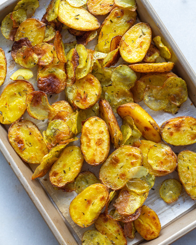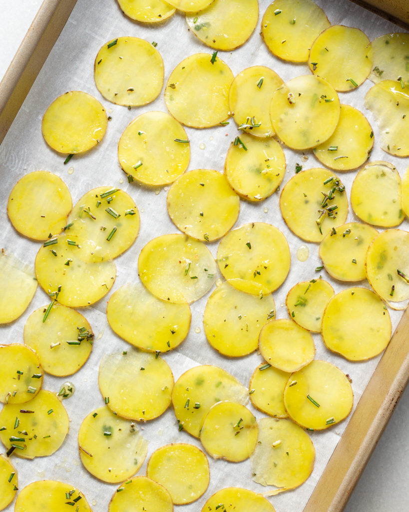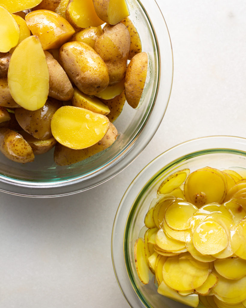 So fun fact, new potatoes aren’t actually a potato variety. They are early harvested potatoes of several varieties! They are part of the “waxy” category of potatoes which does not make them your typical starchy potato used for roasting, but I love them for this recipe because of their creamy interior and delicate skin. The skin makes them easy to thinly slice, and perfect for roasting with the skin-on.
