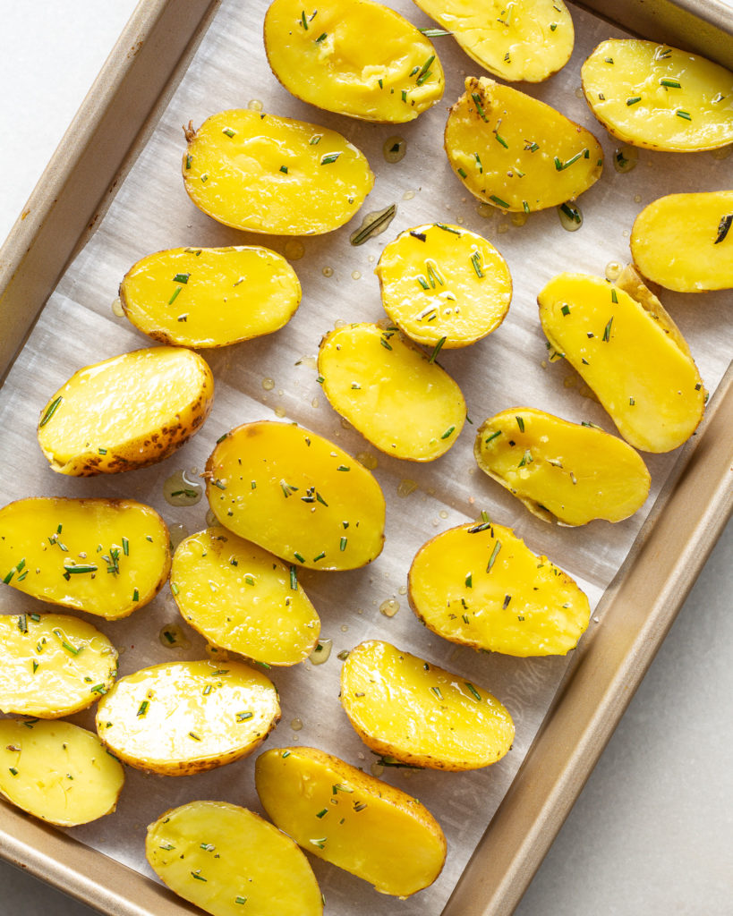 - Prepare two baking sheets with parchment paper. Evenly space out the potato halves on one sheet, and do the same with the potato “chips” on the other.