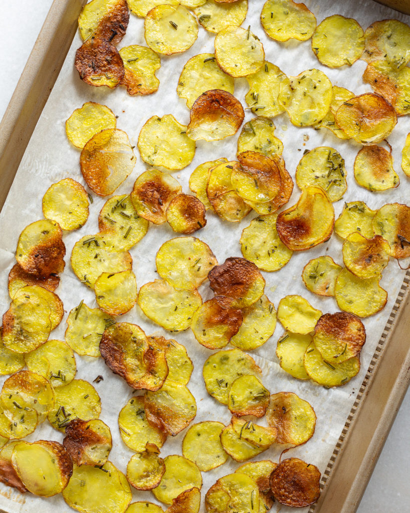 - Roast both baking sheets at the same time at 425F. Remove the potato chips after 6-7 minutes, and flip the potato halves at the 15 minute mark, then cook for another 10 minutes or until golden brown.