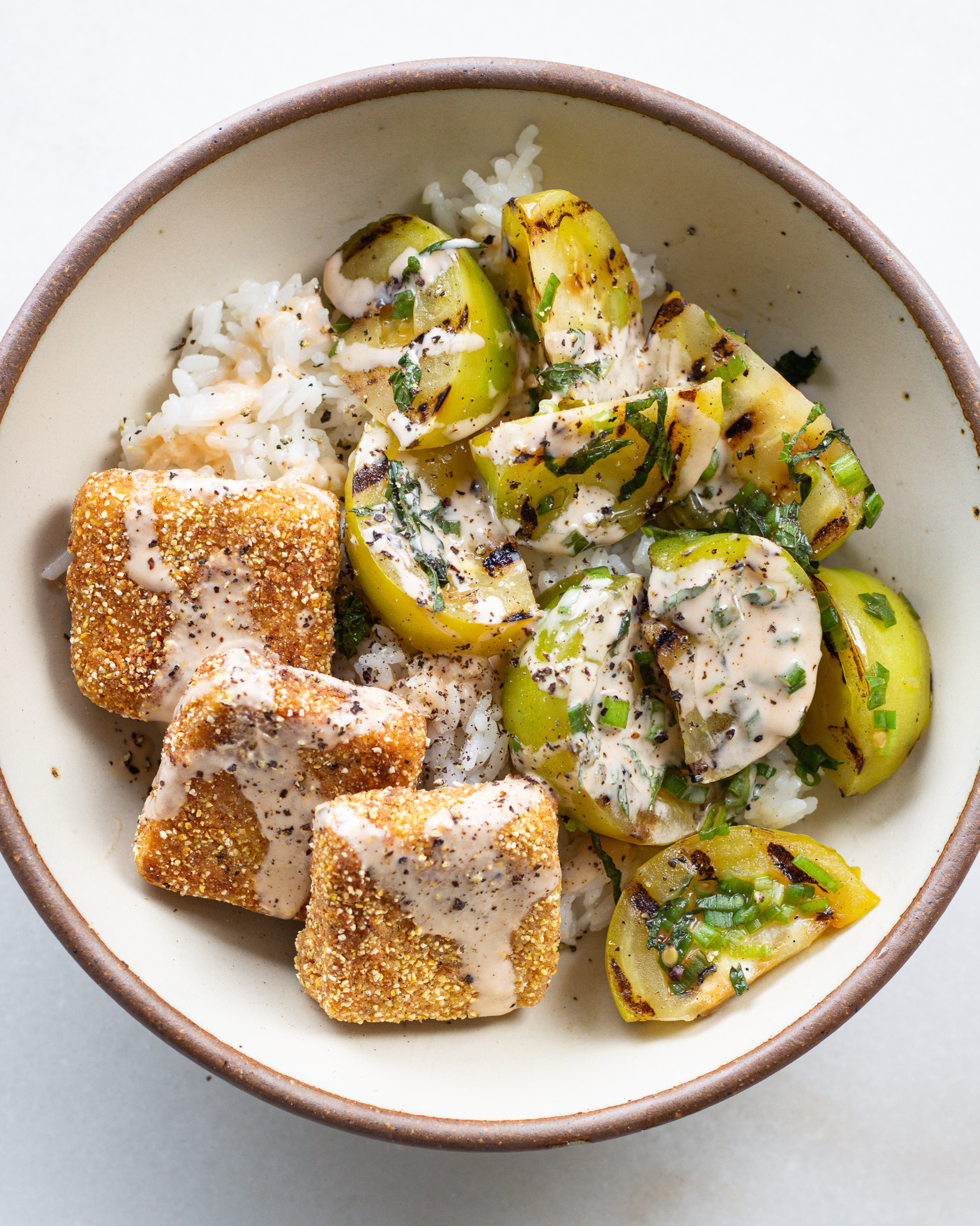 Cornmeal Crusted Tofu with Grilled Green Tomatoes & Hot Tahini