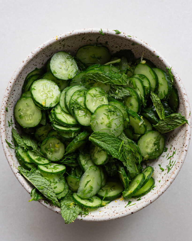- In a medium bowl, add the thinly sliced cucumbers, the chopped dill and the torn mint leaves. Season with a large pinch of salt and then zest in half the lemon. Squeeze over half the lemon juice (about 2 tablespoons) and give the salad a mix. Taste and season with more salt as preferred and set aside.