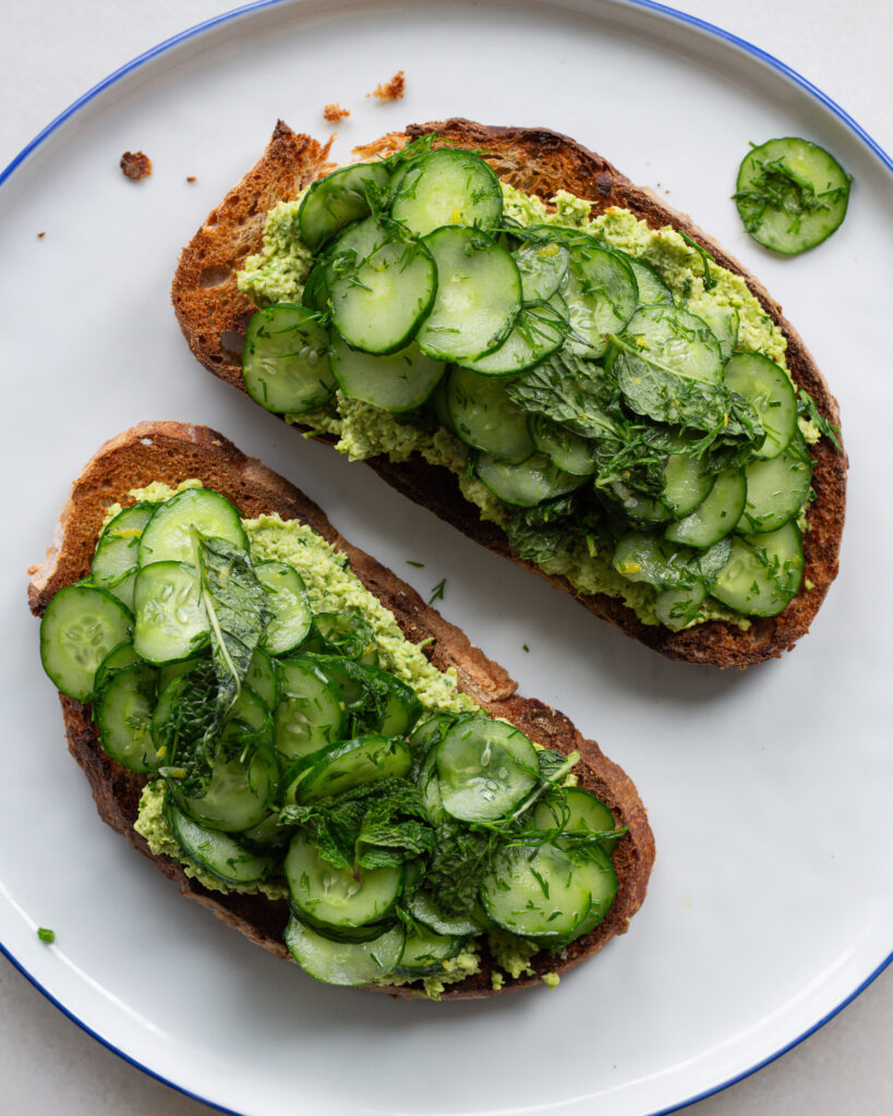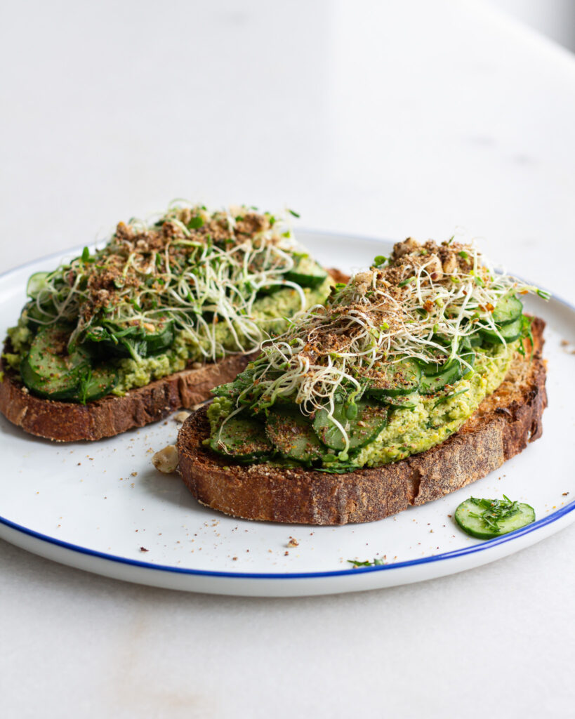 Luckily for you (and not for the people around me when it happened), the hunger that made this toast was an intense one. BUT WOW IS THIS TOAST GOOD. It was supposed to be a sandwich, but when I load up anything this high, how could it not demand fork-and-knife toast treatment? Fork-and-knife toasts are probably up there in my favorite variety of ways to eat bread, and I think it’s because they signify that they are filling and a complete meal. This cucumber variety is not different. On its own, a cucumber salad is a bit “blah” to me, but with a hit of herby edamame spread, fresh sprouts and a salty-nutty sprinkle? It’s a flavor bonanza, and perfect for a lunch to prep throughout the week so you never hit the hunger level that I was at when I made it.