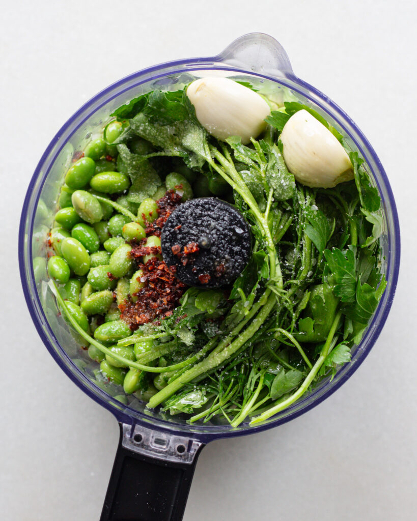 - In a small food processor, add the edamame, tender herbs, red pepper flakes, salt, vinegar and olive oil. Process, scraping down the sides occasionally, until smooth. This may take a few minutes, but it is worth the wait! Add more olive oil as needed, but I find it never needs any. Taste and season with salt, then set aside.