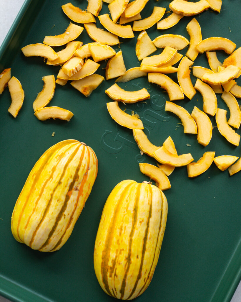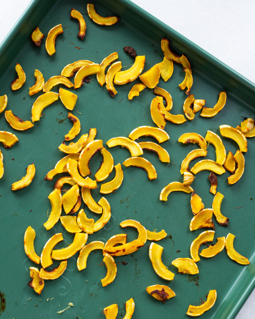 - Preheat the oven to 400°F. Cut and deseed the delicata squash. Cut one squash into small slivered pieces, and leave the other in 2 halves. Roast in the oven for 18-24 minutes, or until the halves are fork tender and the slivered pieces are golden on the bottoms.