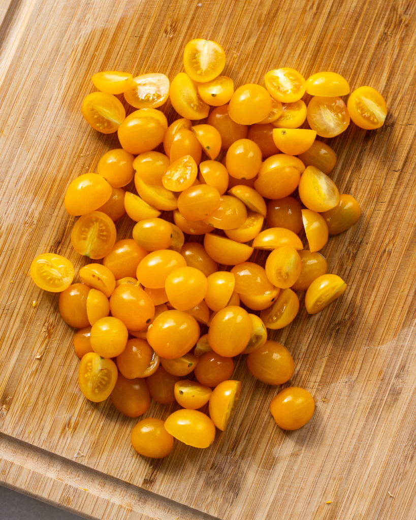 - While the squash is roasting, prepare the rest of the recipe. Halve the tomatoes and finely grate the garlic.