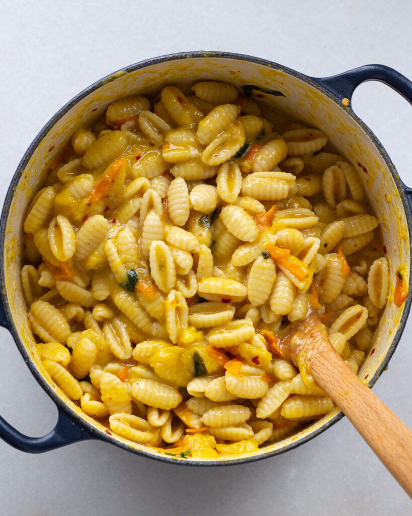 I added chopped kale into the sauce and let it reduce during the simmer phase for some extra fiber and color. As another commenter said, I used a bit of lemon juice to brighten up the rich squashy sauce. Amazing! Thanks for sharing, this will be a go-to!