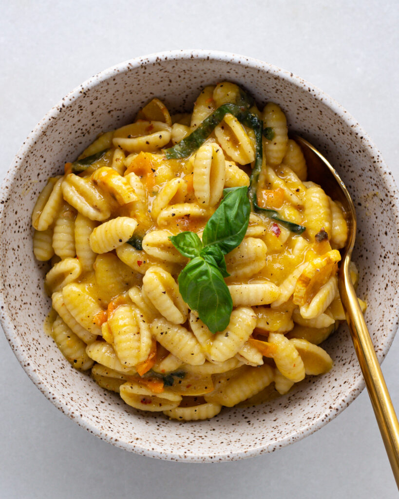 The flavors in this easy weeknight pasta are two-fold – the brightness comes from the cherry tomatoes (I know I say never eat tomatoes in winter, but we have greenhouses! And the cravings were dire) and the creaminess and subtle earthiness comes from the delicata squash. I add a hit of spice with red pepper flakes, and my boyfriend always swears there is cheese in this, even though it’s completely plant-based. This creamy pasta is nothing but classic and delicious, and it’s one of my favorite glossy pastas to add to my regular meal rotation.