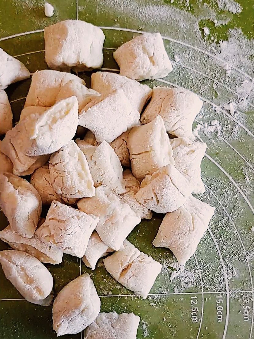 - Use a bench scraper to cut the dough into 1 cm square gnocchi.